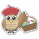Illustration d'une chouette chouette caricaturiste portant un béret rouge français et tenant un panier marron rempli d'oeufs de pâques pastel colorés. Cet adorable et drôle design d'oiseau est une idée cadeau pour les amateurs de chasse aux oeufs de Pâques et les amoureux des animaux.