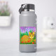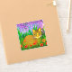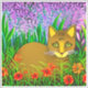 Sticker dans un mignon chat gingembre aux yeux verts, allongé dans un jardin d'été de maîtres rouges et d'hyacinthes violets