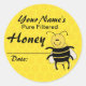 Ces autocollants de conserverie personnalisés s'adaptent sur votre confiture de verre, votre gelée et préservent les couvercles de jarre. Ils ont une image d'un dessin animé souriant d'abeille sur un arrière - plan motif de nid d'abeille. Le couvercle rond de pot en conserve indique, "Votre nom est pur miel filtré" et vous pouvez ajouter votre nom dans le modèle pour personnaliser. Vous pouvez modifier n'importe lequel des mots du modèle. Les autocollants ronds disent aussi, "Date", et vous pouvez écrire dans la date de mise en conserve plus tard. Vous pouvez modifier le style de police ou la couleur pour les customiser. Utilisez ces étiquettes de conserverie personnalisés pour les pots de miel maison et autres cadeaux de cuisine. Vos proches vont chérir les délicieuses friandises que vous avez faites vous-même. Plus de étiquettes personnalisés pour les bocaux au crayon d'Alina.