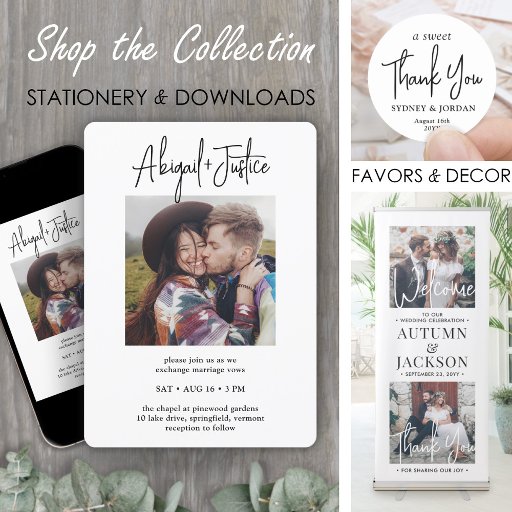 Ajoutez une touche personnalisée élégante aux cartes de remerciement mariages et aux faveurs de réception avec autocollants photo en forme de coeur / scellés d'enveloppe. L'image et toute la formulation de ce modèle sont simples à personnaliser. "Merci" peut être changé en amour & merci, bienvenue, initiales du couple, autre texte, ou il peut être supprimé complètement. (CONSEIL EN MATIÈRE DE PLACEMENT D'IMAGE : Une façon simple de positionner une photo exactement comment vous voulez est de la rogner avant de la télécharger sur le site Zazzle.) Le design moderne de lettrage blanc présente une calligraphie manuscrite tendance, des noms et une date typographiques serif classiques et une photo de votre choix. Ces étiquettes sont une façon élégante d'express la gratitude aux amis et à la famille pour avoir partagé votre célébration spéciale de la journée.