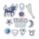 Célébrez la force solide et stable du Taureau avec cette collection de stickers du zodiaque magnifiquement détaillée. Avec une illustration céleste du Taureau, de la constellation du Taureau, du symbole du zodiaque, du symbole de l'élément Terre et du symbole de la planète régissante Vénus, ce design est entouré de lunes rêveuses, de planètes et d'étoiles pour une atmosphère cosmique magique.