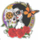 Un crâne à sucre est assis derrière une femme portant une journée de maquillage de crâne à sucre mort, le tout dessiné dans un style Art nouveau.