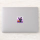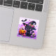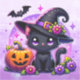 Un adorable autocollant d'Halloween qui met en vedette un mignon chat noir dans un casquette de sorcière avec un citrouille. chauve-souris et éléments mignons violet et orange.