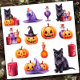 Une feuille de stickers Halloween colorés en violet, rouge et oranges avec bougies, citrouilles, bouteilles de potion et chats noirs.