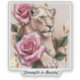 Un tatouage réaliste d'une lionne tenant un rose avec une longue tige, mélangeant force et beauté. Des accents dorés subtils mettent en valeur le rose, mis contre un arrière - plan texturé doux pour un look raffiné et puissant. "Image originale générée par Meta AI. L'IA a généré des oeuvres d'art. Licence CC BY-SA 4.0.