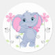 This round sticker is shown in white with a cute elephant and pink flowers print.