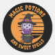 Célébrez Halloween avec cet adorable autocollant de sorcière ! Doté d'une mignonne sorcière de dessin animé aux cheveux violets et d'un casquette noir, se tenant derrière un chaudron vert bouillonnant. Un petit citrouille est installé à proximité, et l'arrière - plan montre un coucher de soleil chaud avec une lune au croissant d'orange. Parfait pour décorer des carnets, des ordinateurs portables, des sacs à gâteaux ou des cadeaux. Whimsical, amical et amical, cet autocollant ajoute magique Halloween fun partout où il va!
