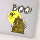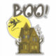 Joyeux halloween tout le monde. Maison hantée avec une sorcière volant au-delà d'une pleine lune.