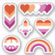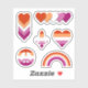 Autocollants vinyle taillés sur mesure avec une variété de motifs aux couleurs du drapeau de la fierté lesbienne; les formes incluses : un signe de paix, les coeurs, une fleur de lis, des crayons et un arc-en-ciel