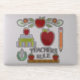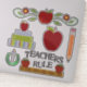 Fiche d'autocollants à thème de l'enseignant avec des graphiques de pommes rouges, des livres empilés, crayon, règle et symbole d'éducation. Le texte graphique noir, avec la règle, lit la Règle des enseignants.