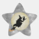 Silhouette de sorcière sur un balai avec le feu qui sort du balai et un chat noir perché sur la poignée contre une pleine lune ronde.