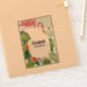 Brochure de vinyle / autocollant de contour avec un flamant rose mignon et capricieux. Entouré de feuilles tropicaux verts, de fleurs d'hibiscus rouges et jaunes. Un cadre de dégradé doré en forme de rectangle au centre.