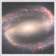 Galaxie spirale NGC 1300. La lumière radio est représentée en jaune et met en évidence les nuages de gaz moléculaire froid qui fournissent la matière première à partir de laquelle les étoiles se forment. Les couleurs rouge et magenta capturent l'impact des étoiles jeunes et massives sur leur gaz environnant. La lumière visible et ultraviolette met en évidence les voies de poussière en or et très jeunes étoiles chaudes en bleu.