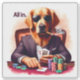 A golden retriever in a sleek black suit sits confidently at a poker table, wearing sunglasses and holding a hand of cards.