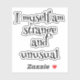 Sticker gothique étrange et inhabituel - Citation alternative - Beetlejus Inspiré Express votre côté sombre et décalé avec cet autocollant gothique audacieux avec la citation préférée du culte : "Je suis moi-même étrange et inhabituel." Parfait pour les ordinateurs portables, les carnets, les bouteilles d'eau, les journaux ou même l'emballage cadeau éffrayant. 💀 Idéal pour : Amateurs de Beetlejus et de Tim Burton Style alternatif, gothique ou esthétique sorcière Décorations d'Halloween ou vibes déplaisantes-mignonnes toute l'année Fabriqué avec du vinyle durable, cet autocollant est étanche aux intempéries, durable, et fait un grand cadeau ou accent personnel. Ajoutez un peu d'étrangeté et d'insolite à votre vie quotidienne.
