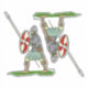 Habillé de byrnie (mailshirt court) et de spangenhelm (casque composé de plaques rivées à un cadre de bandes), un guerrier anglo-saxon du Moyen Âge porte un bouclier rond et manipule une lance ailée dans cette illustration originale de Richard H. Fay.
