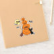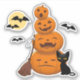 Un mignon chat noir et un balai de sorcière près d'une pile de citrouilles riants qui tombent.