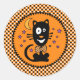 Des autocollants amusants d'Halloween avec un chaton souriant noir portant une cravate arc à carreaux orange, noir et blanc, entourés d'étoiles violettes et de lune jaune. Bordure à carreaux orange, noir et blanc. Parfait pour vos invitations et cartes de fête d'Halloween. Couleur arrière - plan personnalisable. T-shirts coordonnés pour bébé, enfants et adultes, sacs fourre-tout, tasses, étiquettes d'adresse de retour, autocollants, timbres-poste, enveloppes également disponibles! PinkInkArt original !