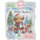 A cartoon Highland cow wearing a Santa hat and a scarf sits next to a Christmas tree decorated with ornaments. The cow is holding a mug of hot chocolate.