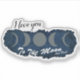 This sticker includes the text "I love you to the moon and back" on a space background with the moon phases in between the text. It makes a perfect gift for a family member or significant other.