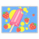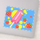 Décal vinyle sur le thème de l'été. Conçu avec du popsicle rose et quelques fraises rouges qui tombent autour du popsicle avec quelques éclaboussures de peinture jaune. Arrière - plan bleu.
