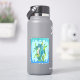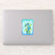 Ce sticker en vinyle a un dragon imaginaire à cheval de mer avec des cornes qui est bleu, vert et blanc avec des cornes et sa queue enroulée autour des algues dans différentes nuances de vert avec des bulles d'eau flottante dans une eau comme un cadre ondulé dans les nuances de bleu.