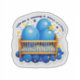 Blue balloons tied to a tiny crib, with toy trucks and stars around. Text in bold bubble font: “Little Prince Incoming!”