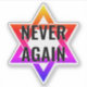 Noir JAMAIS DE NOUVEAU L'autocollant du Souvenir de l'Holocauste, montrant l'étoile multicolore de David et le libellé jaune JAMAIS DE NOUVEAU. Offres, ressources et vêtements correspondants disponibles. Idéal pour la commémoration de l'Holocauste et/ou les célébrations de Yom HaShoah.