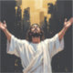 A striking emotional ai depiction of Jesus Christ Our Savior in black and gold. Jesus raising his arms to the Heavens with a black and gold impasto oil background.