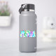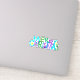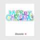 Cet autocollant en vinyle est le texte Joyeux Noël en lettres colorées vives en bleu, vert violet et rose avec des ornements ronds et des étoiles jaunes.