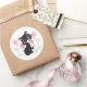 This round sticker is shown in white with a cute kitty and pink flowers print.