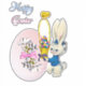 Autocollant Joyeuses Pâques pour les célébrations festives. L'illustration représente le lapin de Pâques en bleu avec un oeuf rose décoratif et un panier de Pâques avec un poussin. Utilisez cet autocollant pour étiqueter des objets artisanaux, des livres et plus encore !