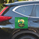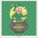 Sticker en vinyle avec l'illustration d'un leprechaun souriant portant un costume vert, une cravate arc-en-ciel, et un casquette bowler assis à l'intérieur d'une casserole d'or et tenant une pinte de bière, avec arc-en-ciel jaune, vert et orange dans l'arrière - plan. L'image est placée sur un arrière - plan vert foncé transparent avec des shamrocks. Un design parfait pour célébrer la Saint Patrick !
