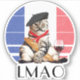 Si vous essayez de prononcer LMAO, vous avez l'air d'un chat français ! Le meow ! Tourner drôle vers l'abréviation en argot de Laughing My A@$ Off. Comprend un dessin d'un chat tabby français avec une moustache et portant un béret et un mouchoir rouge. Il est assis contre un arrière - plan des couleurs du drapeau français, a un verre de vin rouge et tient une miche de pain français.