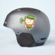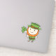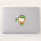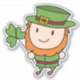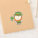 Lutin de dessin animé comique portant un chapeau et un costume verts, ayant une barbe rousse et tenant un trèfle porte-bonheur.