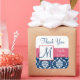Autocollant bleu marine et blanc Mariage damassé floral Favor avec accent rose et monogramme initial. Conception par Elke Clarke©. Carte graphique sous licence. Vous avez besoin d'une couleur différente ou d'aide, veuillez contacter luxuryweddinginvitations@gmail.com