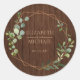 Rustique, moderne et tendance, ce modèle classique d'autocollant mariage rond présente un faux cuivre géométrique agrémenté de verdure d'eucalyptus aquarelle, sur une texture chaleureuse en bois de grange. Les noms du couple et la date du mariage sont dans une couleur cuivre correspondante. Fait partie d'un ensemble correspondant. Copyright Invitations élégants. Tous droits réservés.