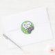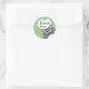 Mignons stickers pois vert. Un grand coeur d'amour blanc avec les mots merci à l'intérieur. En bas à droite est un amusant chat kitty en gris et blanc de dessin animé. À gauche du chat se trouvent trois petites étoiles jaunes.