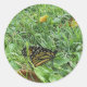 Un autocollant rond, avec une belle photo d'un papillon Monarque allongé dans l'herbe dessus. Photo de = (P.J.M. )