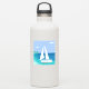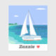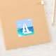 Un voilier (un yacht) avec votre nom sur elle s'approchant d'une plage. Jour ensoleillé au bord de l'océan. Vue sur la mer tropicale. Un rivage aux palmiers verts. Bleu, turquoise, mousse de mer, turquoise, vert, blanc. Très design et design.