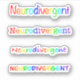 Le mot "NEURODIVERGENT" écrit quatre fois en couleurs arc-en-ciel et différentes polices. Ce pack d'autocollants de typographie est destiné à promouvoir la neurodiversité. Embrassez la neurodiversité et les esprits d'amour de toutes sortes avec ces autocollants couleur arc-en-ciel de la neurodiversité!