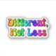 Un design de typographie rétro arc-en-ciel avec les mots "Différent, pas moins" pour soutenir et promouvoir la conscience de la neurodiversité et l'acceptation de l'autisme.