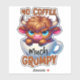 A funny and sarcastic colorful design showcases an adorable highland cow perched in an empty coffee cup. With a grumpy expression, big blue eyes, and brown fur, the cow adds a charming touch. The vibrant text reads, "No coffee much grumpy." This design is featured on a variety of products, making it a perfect gift for coffee enthusiasts.