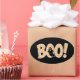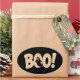 Fun Halloween sticker featuring "BOO!" in orange gingham letters with a spooky ghost. Great for decorating envelopes, gift bags, or party favors.