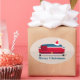 Un sticker Joyeux Noël avec un canapé en tenue Père Noël. Les mots sont en bleu et personnalisables. Père Noël Canapé Noël Sticker ovale Vacances Design | ©Melissa Patton - Artiste/Illustrateur