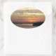 Un autocollant ovale pour les livres, les carnets et bien plus et présente l'image pittoresque d'un coucher de soleil orange spectaculaire sur l'eau ainsi que les paroles inspirantes de la Prière de Sérénité.