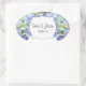 Cet autocollant ovale présente une photo de magnifiques hydrangées violettes comme l'arrière - plan et le libellé personnalisable pour les noms de la mariée et du marié et leur date de mariage.