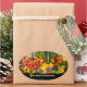 Un autocollant coloré de temps de récolte avec fruits et légumes, fleurs et feuilles par une clôture en bois, ajoutez le texte de votre choix.