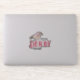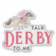 Cet autocollant sur le thème de Derby comporte un cheval de course à l'aquarelle avec un jockey en rose entouré d'une couronne de roses rouges avec la phrase "Parle DERBY à Moi". Il y a un fond rayé noir et blanc.
