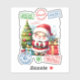Un autocollant de Noël exquis présente un joyeux Père Noël tenant une boisson chaude, entourée de boîtes-cadeaux colorées et d'ornements éclatants.